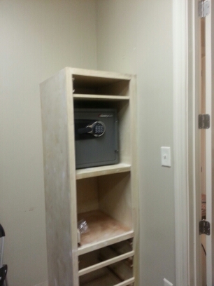 While doing other misc. repairs the client asked if I could install a safe somewhere in a large closet. My solution was to make a cabinet that blends in in the closet and offers a modest level of concealment for the safe. The client had a mirror that they wanted to make use of also.