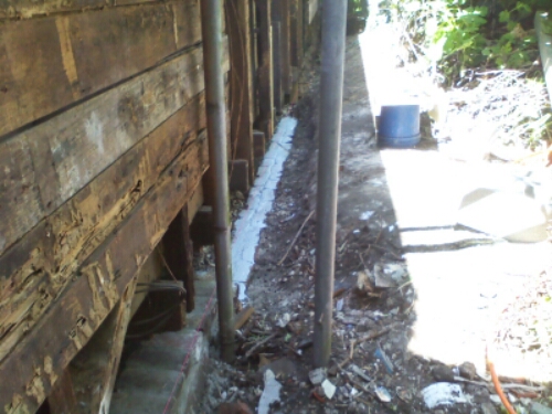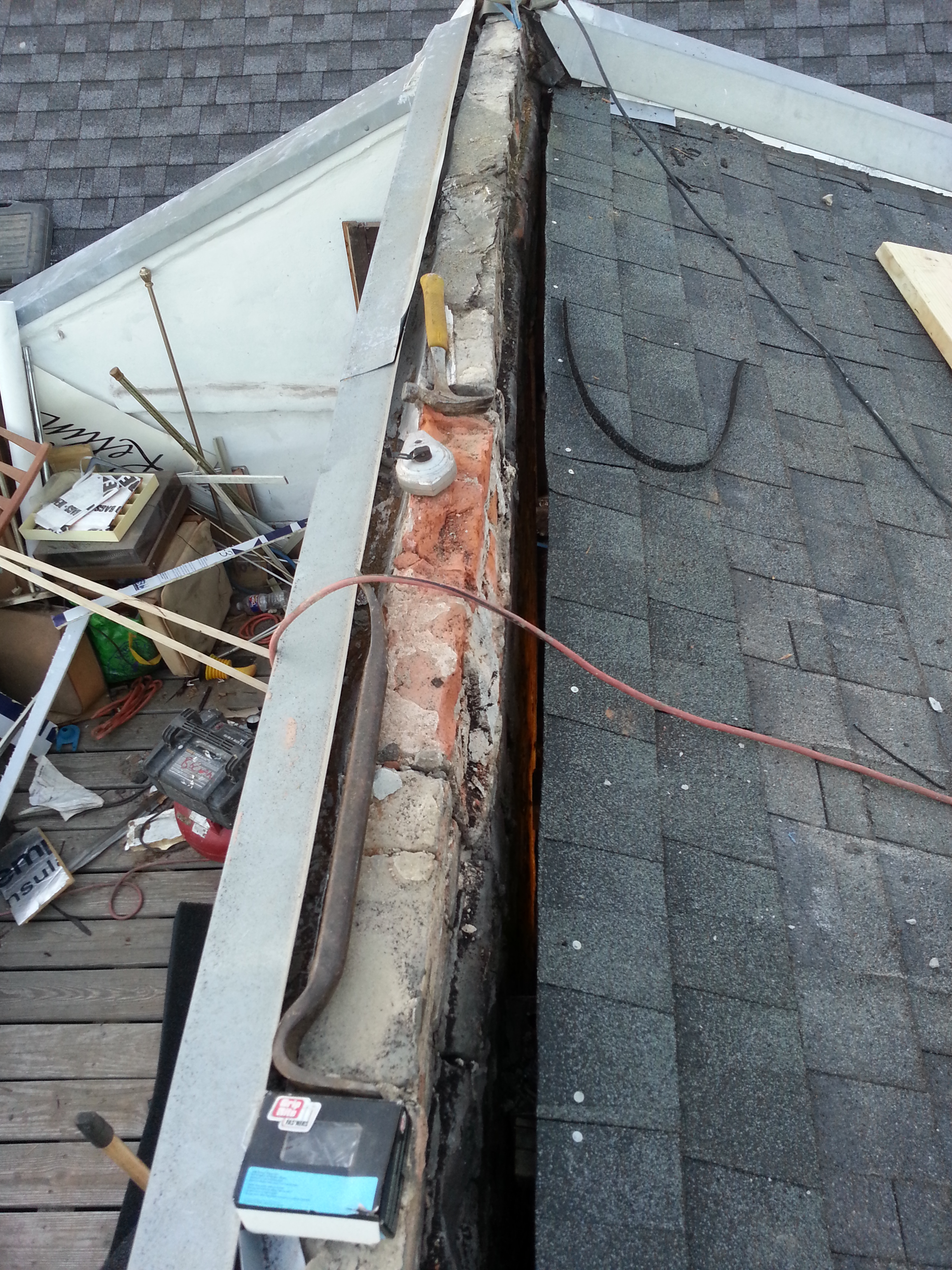 The original ridge board was missing. The roof was being supported by posts sitting on the ceiling joists. So the rafters at this point where not adequately supported or connected to the wall. The roof flashing was removed and the roof cut back so that a new full length ridge board could be installed.