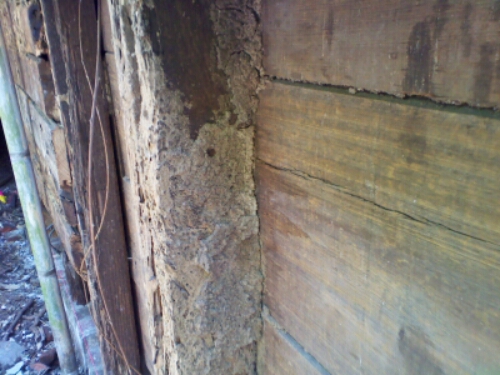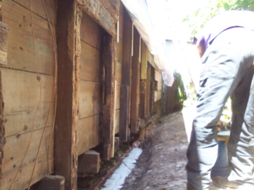 Rafters inset into the ridge board for complete support and solid connecting point. Mortar has been poured behind the ridge board to fill in any space between it and the wall.