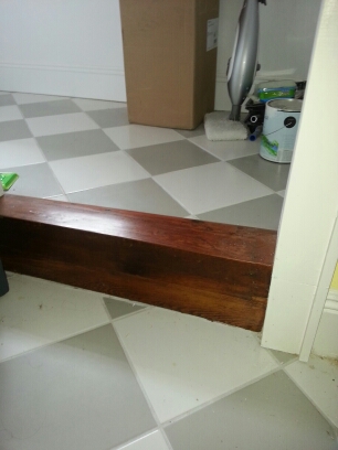 This theshold is made from dumpster trash. It makes a transition from the kitchen to laundry room. The floors are out of level and the frame is twisted etc… but this threshold looks good.