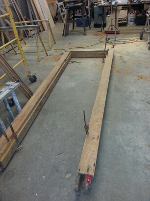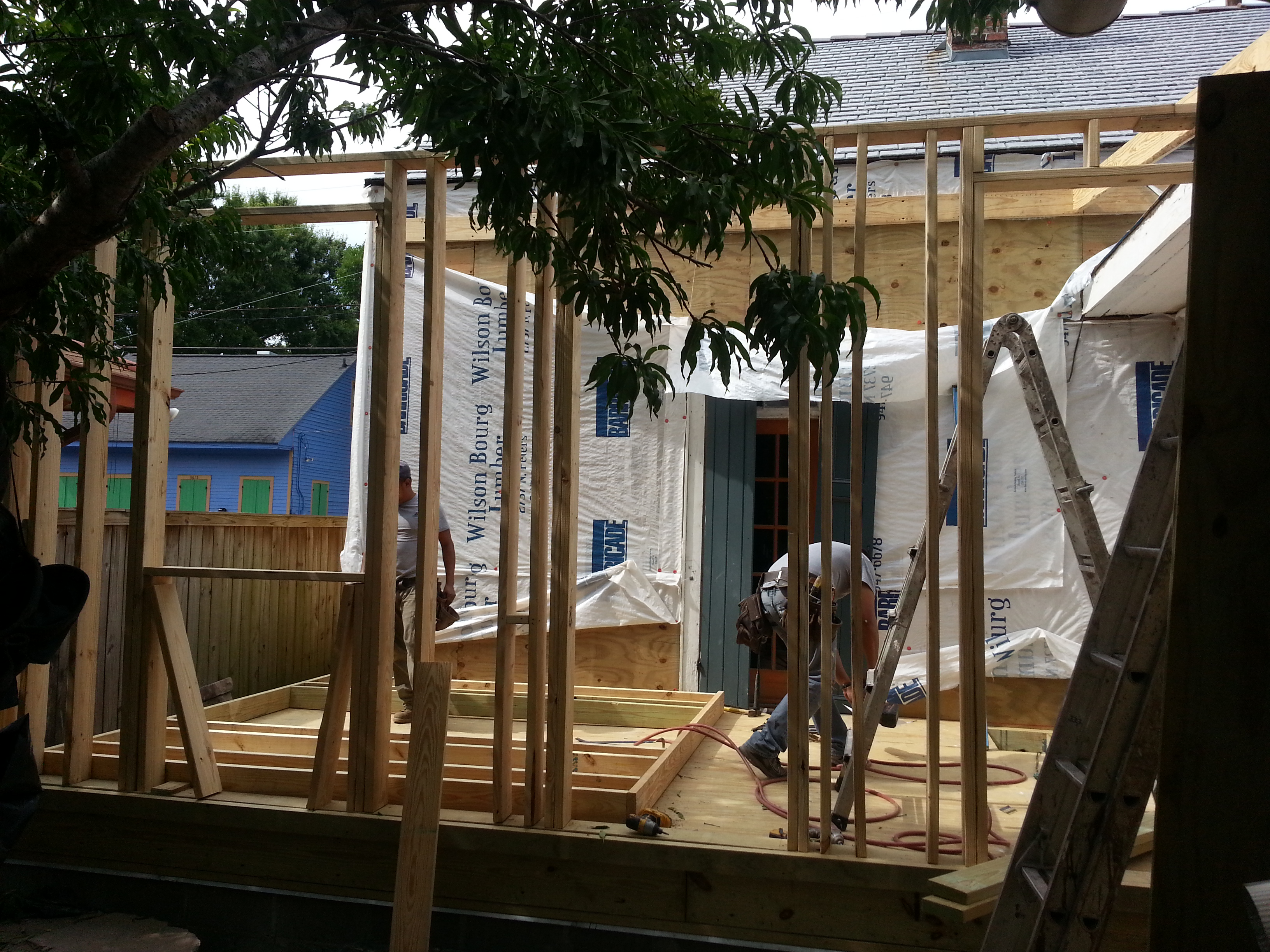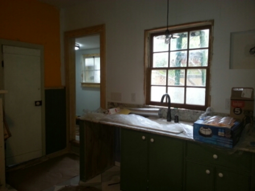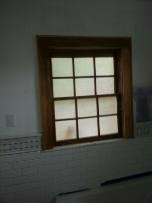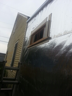 Bathroom addition built to match house. Doors and windows are salvage. Window frames and sashes have been resized. Wall system consists of insulated 2×6 framing, magnesium structural panels, radiant barrier foil and cementitious siding separated from house with wood furring strips.