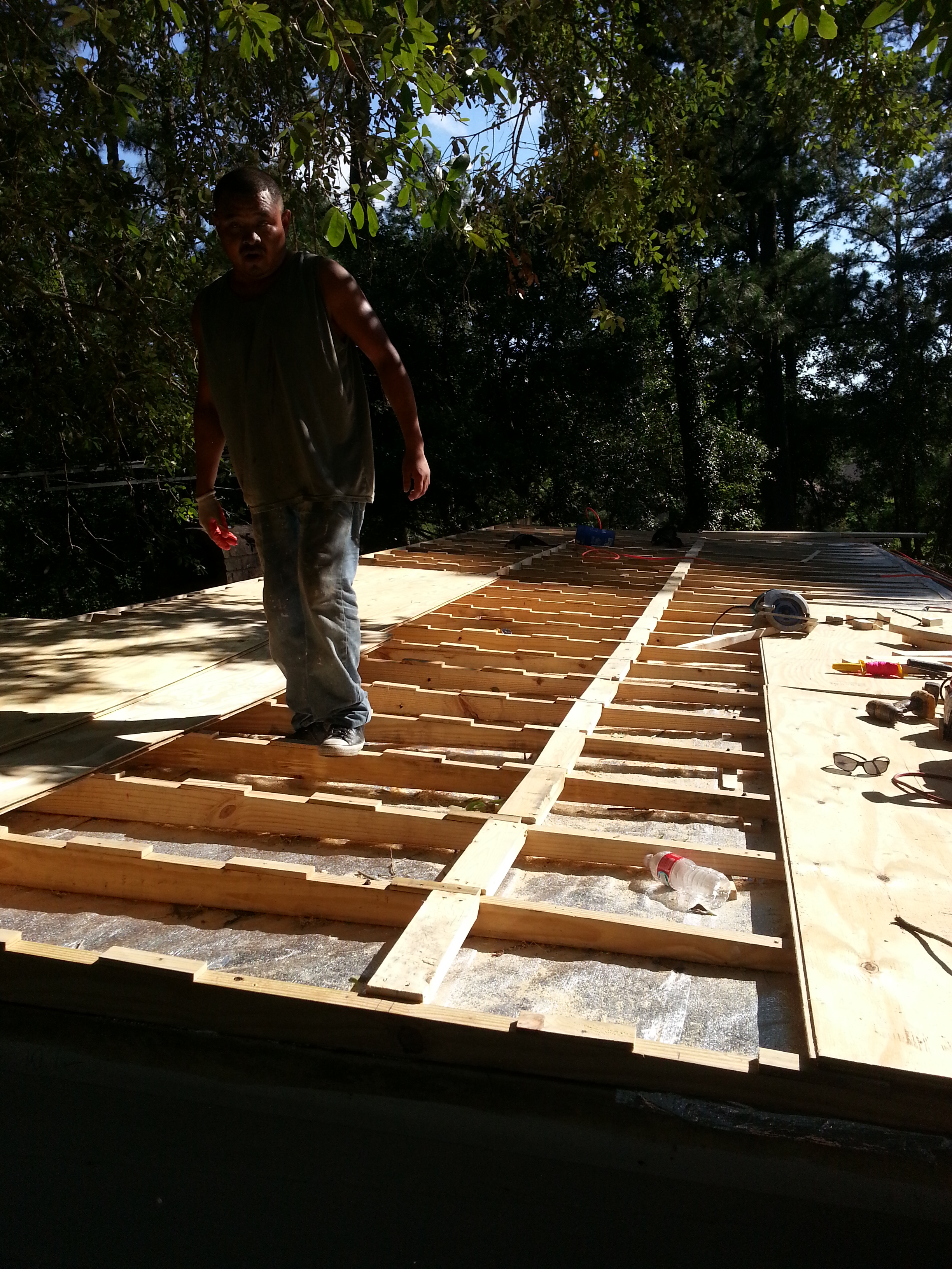 Old flat roof has radiant barrier installed. 2nd roof is repitched and well vented. Top roof is shimmed to partially separate deck from joists and allow cross ventilation. Rear facia is vented across all joist bays.
